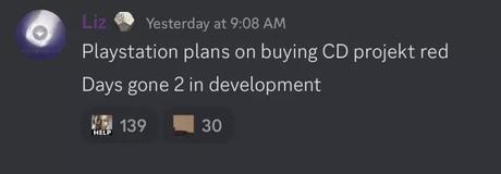 En insider med smeknamnet Liz, som specialiserar sig på nyheter om uppdateringar och tillägg för Destiny 2, rapporterade i sin Discord-server att Sony planerar att köpa CD Projekt.