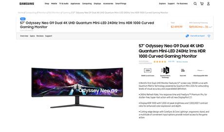 Samsung Odyssey Neo G9 har en Mini LED-skärm med en ramuppdateringsfrekvens på 240 Hz, en upplösning på 7680 × 2160 pixlar och en diagonal på 57 tum. Panelens bildförhållande är 32: 9 och böjningsradien är 1000R. Nyheten stöder AMD FreeSync Premium Pro-teknik och levereras med DisplayPort 2.1, RGB-bakgrundsbelysning och VESA Display HDR1000-certifiering.