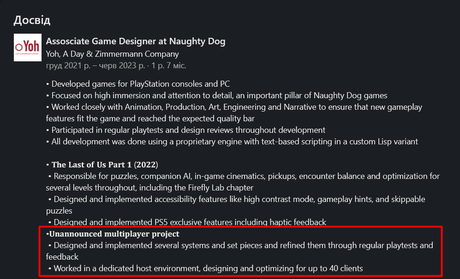 LinkedIn-profilen för Ian Blake, som var speldesigner på Naughty Dog fram till juni 2023, avslöjade att han arbetade i studion med ett oannonserat onlineprojekt, som förmodligen är multiplayer-spelet The Last of Us. Han uppgav att han skapade en lobby som stöder upp till 40 spelare, samt skapade andra system. Vi skulle alltså förvänta oss ett storskaligt 20v20-läge, men om vi någonsin kommer att få se det är ett stort mysterium.