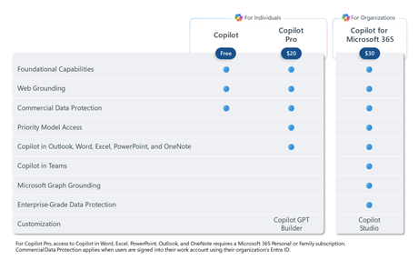 Utöver företagsversionen har Microsoft två andra erbjudanden med Copilot - en kostnadsfri grundversion som en chatbot och Copilot Pro med avancerad funktionalitet för enskilda användare för 20 USD per månad.