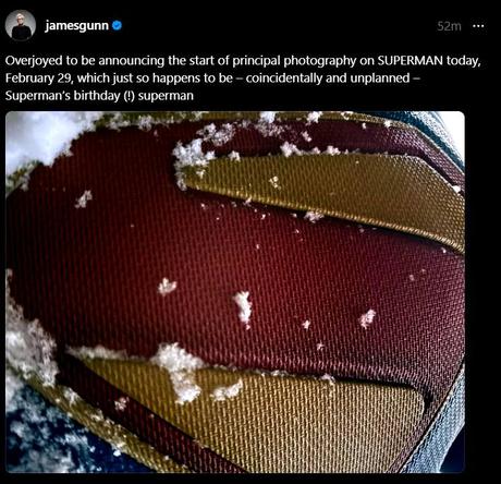 "Jag är överlycklig över att kunna tillkännage att inspelningen av SUPERMAN startar idag, den 29 februari, vilket råkar vara - av en slump och oplanerat - Stålmannens födelsedag (!) När jag var klar med det första utkastet till manus kallade jag filmen för Superman: Legacy. När jag skrev klart det sista utkastet stod det klart att titeln skulle vara SUPERMAN. På väg till dig i juli 2025. Grattis på födelsedagen, Clark!"