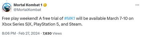 Mellan den 7 och 10 mars kan användare av PC (Steam), PlayStation 5 och Xbox Series uppleva Mortal Kombat 1 helt gratis.