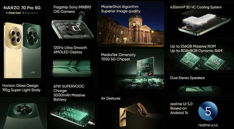 Realme Narzo 70 Pro 5G drivs av en åttakärnig MediaTek Dimensity 7050-processor i kombination med 8 GB LPDDR4X RAM och 128/256 GB lagringsutrymme. Gadgeten levereras med en fingeravtrycksläsare under skärmen, en 16 MP frontkamera och en 50 MP huvudkamera (Sony IMX890 med OIS) + 8 MP + 2 MP. Nyheten har stereohögtalare och IP54-skydd. Smarttelefonen drivs av ett 5000 mAh batteri. Enheten stöder 67W snabbladdning.