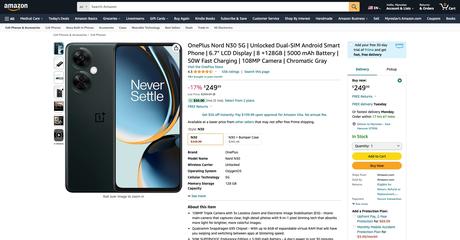 Vi pratar om OnePlus Nord N30 5G-smarttelefonen för $249.99 $299.99, -17%$ $249.99 $299.99, -17%). Gadgeten säljs i Chromatic Gray-färg och 8/128 GB-version.
