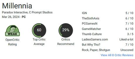 Millennia fick 67 poäng på Metacritic och 60 poäng på Opencritic, med endast 29% av rekommendationerna.