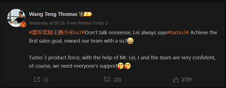 Samma dag meddelade Lei Jun att han skulle ge SU7:orna till Redmis VD, Wang Teng Thomas, om det första försäljningsmålet för den nya Redmi Turbo 3-telefonen uppfylls. Detta tillkännagivande kom direkt efter att Redmi officiellt meddelat lanseringsdatumet för Turbo 3 den 10 april.