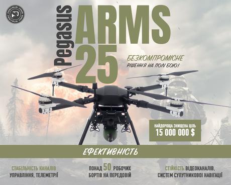 Nyheten fick namnet Pegasus Arms 25. UAV:n har fått modern teknik och ett inbyggt system för motåtgärder mot elektronisk krigföring. Drönaren kan nå hastigheter på upp till 120 km/h och bära last som väger upp till 14 kg. Flygtiden för Pegasus Arms 25 är upp till 45 minuter och den taktiska räckvidden är upp till 20 kilometer.