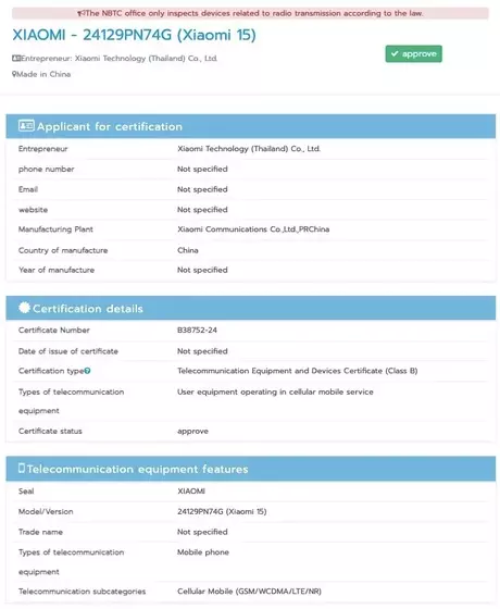Information om Xiaomi 15 på NBTC:s hemsida. Källa: MySmartPrice MySmartPrice