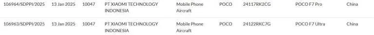 Information om Poco F7 Pro och Poco F7 Ultra på Indonesia Telecoms certifieringswebbplats. Illustration: mysmartprice
