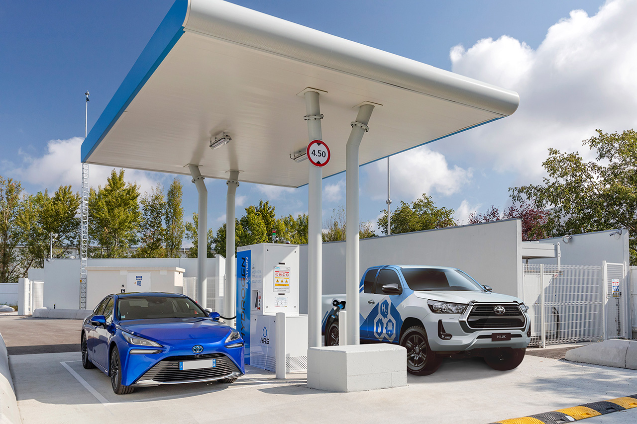 Illustrativ bild av en Toyota Mirai (vänster) och Toyota Hilux vid en vätgastankstation. Illustration: Toyota