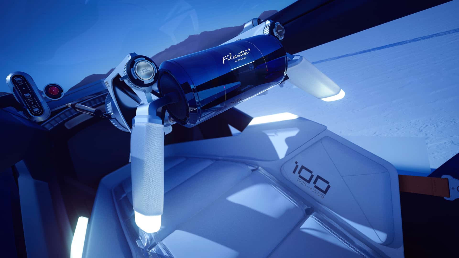 The design is not only futuristic, but also as aerodynamic as possible. The front round headlights are a hint of the 40 CV des Records of the 1920s, the wheels are carried outwards like a 1934 Nervasport and the arches are a reference to the 1956 turbine-powered Etoile Filante.