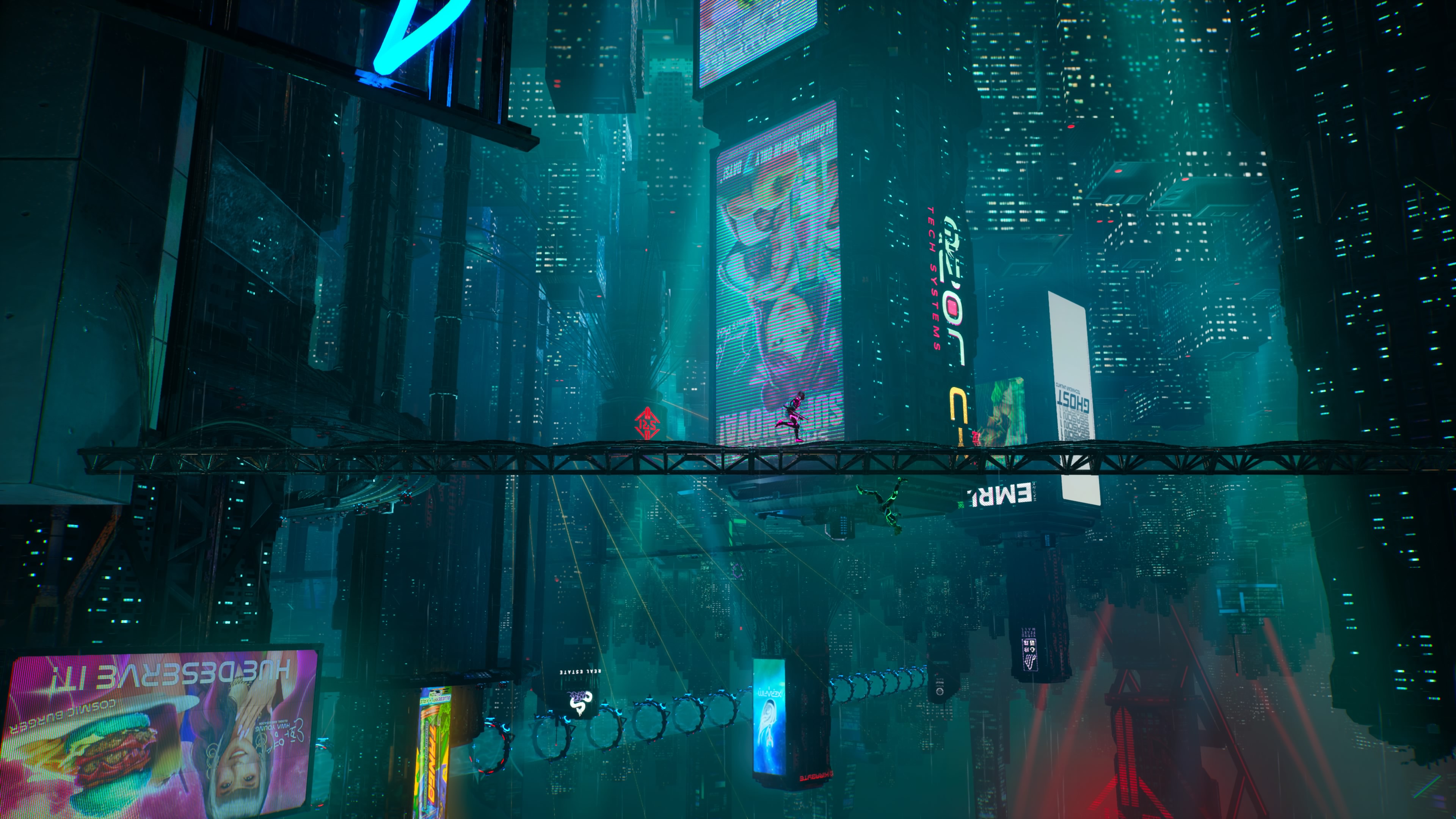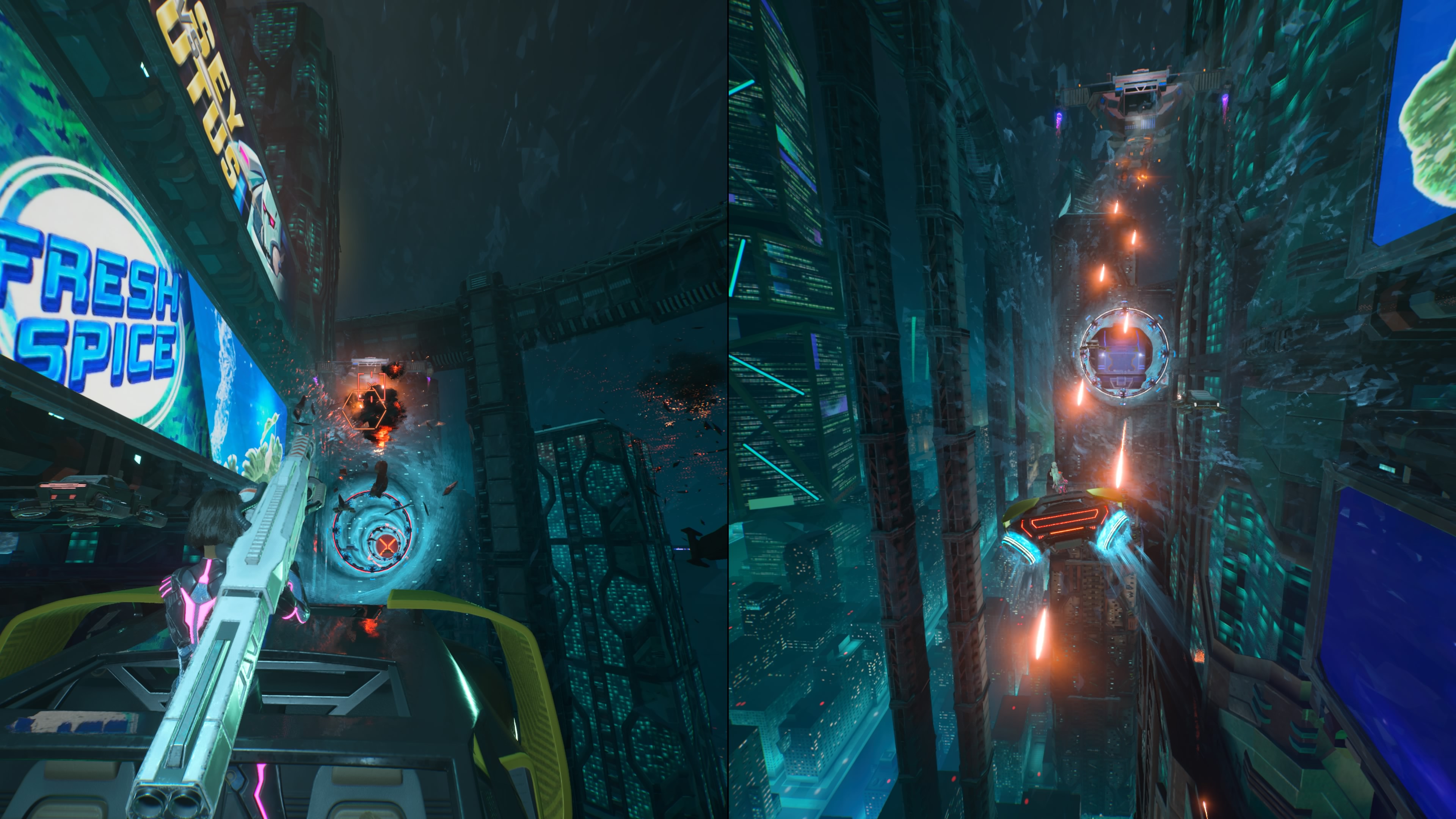 I Split Fiction förändras alltid något, även inom ett enda kapitel. Här är vi, en cyberninja i en enorm cyberpunkstad, men vi kommer inte bara att springa runt med svärd hela tiden. Vi måste lösa pussel som leker med rymden, där interaktionen med varandra är det viktigaste. Sedan kastas man in i en biljakt, där man måste skjuta ner polisbilar, parkera och hugga sönder skurkar.