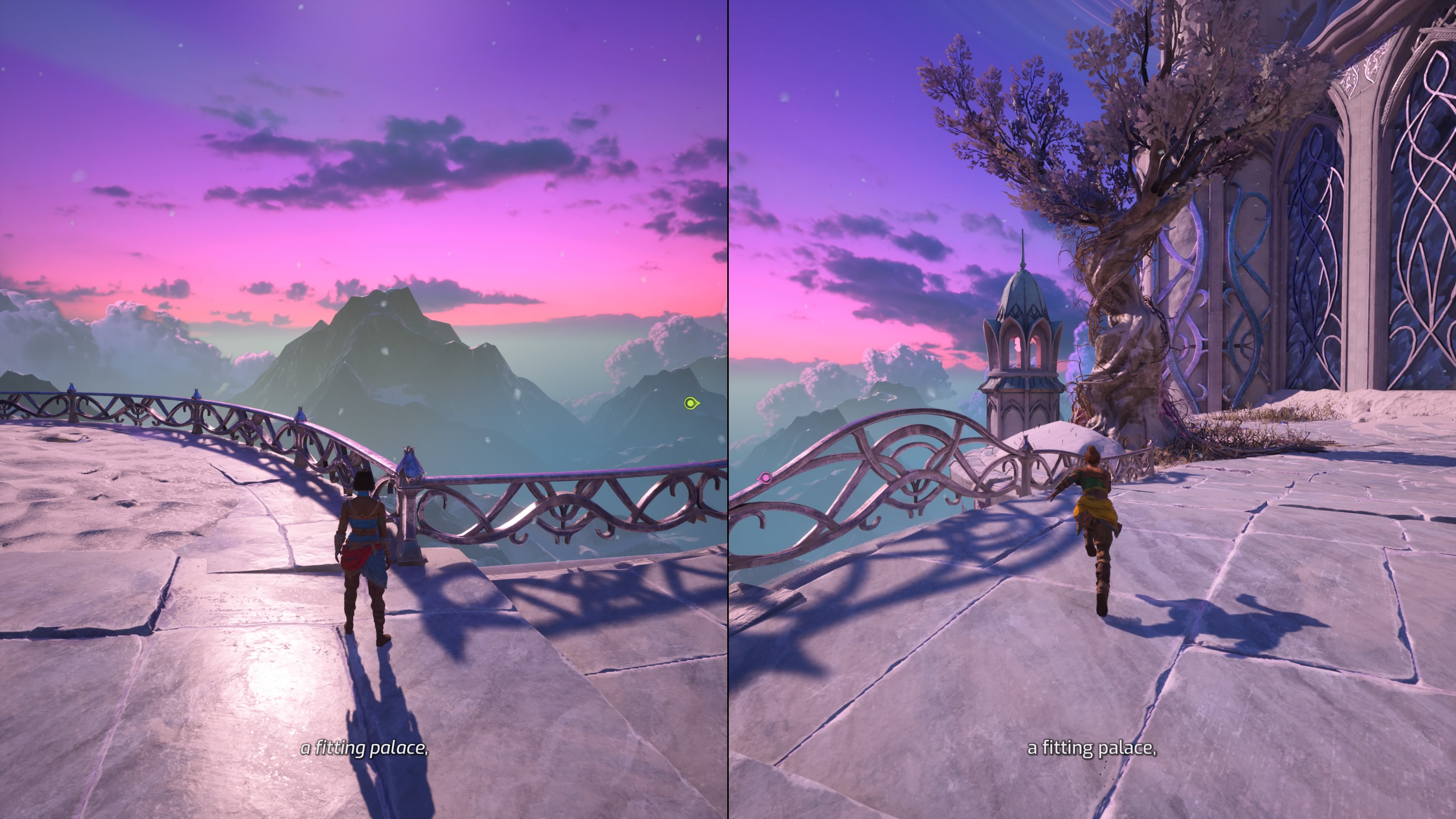 Grafiken i Split Fiction är fantastisk. Som i fallet med spelet ändrar spelet ständigt bilden och du kan se nya vackra platser hela tiden. Och de gjorde ett bra jobb med detaljerna. Sci-fi-nivåerna är fyllda med neon, höga byggnader, olika skyltar, en oändlig ström av bilar och ljusa effekter som ständigt finns på skärmen. Fantasy-nivåerna känns också storskaliga, men neon och skyskrapor ersätts av utsökta slott, täta skogar, statyer och en harmonisk kombination av natur när vinterängen är täckt av röda löv.