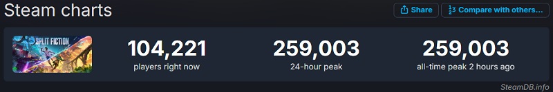 Vi rapporterade redan att den första dagen efter lanseringen av Split Fiction online-toppen i Steam översteg 100 tusen personer, men det var tydligt att detta antal kommer att växa betydligt under nästa helg. Och så hände det: under helgen närmade sig det maximala antalet samtidiga spelare i Split Fiction 260 tusen. Det finns ingen sådan statistik för andra plattformar, men det råder ingen tvekan om att spelet åtnjuter ett enormt intresse även där.