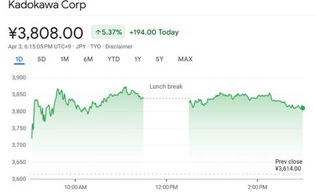 Kadokawas aktiekurs. Källa: Finance Google