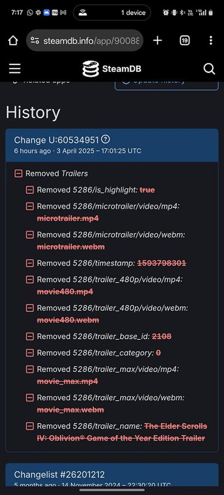 En uppmärksam användare under smeknamnet JavaTheHuttese fann i SteamDB-databasen att Bethesda tog bort Oblivion-trailers från spelets Steam-sida.