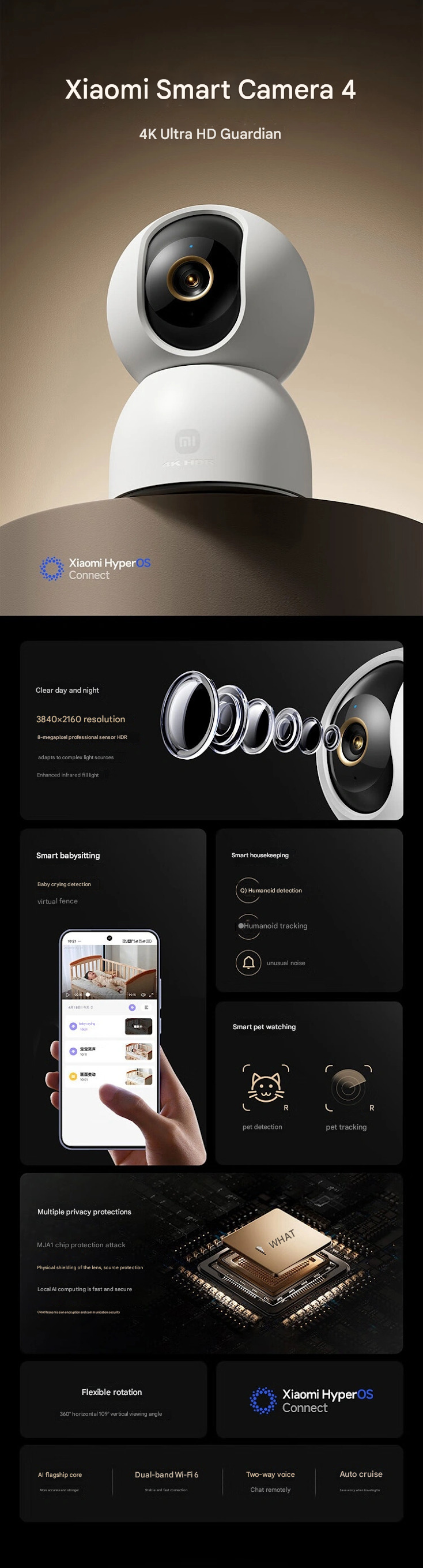 Utöver detta är Xiaomi Smart Camera 4 utrustad med en 1T AI-chip som ger dynamisk spårning av människor och djur. Det finns också en inbyggd dubbelmotor gyroskop som erbjuder en 360-graders horisontell och 109-graders vertikal synvinkel. För integritet stöder kameran dual-band Wi-Fi 6 med fyralagers säkerhet och en inbyggd Mijia-säkerhetschip.