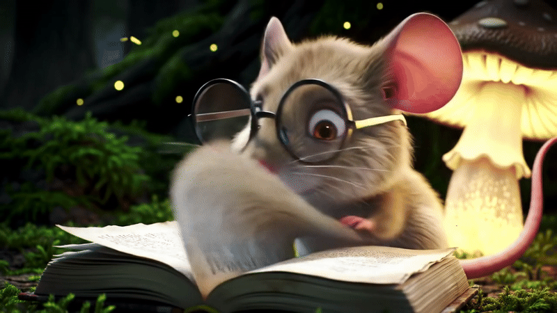En animerad bild av en liten mus med stora glasögon som läser en bok i ljuset från en lysande svamp i ett mysigt skogshål.
