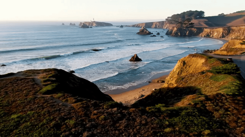 En uppsikt över en grönskande klippkant ovanför en sandstrand med vågor som slår mot stranden. Nära stranden reser sig en majestätisk stenklippa från havet, belyst av det varma, gyllene ljuset från gryningen eller solnedgången, vilket förmedlar den stillsamma skönheten vid Stilla havets kust.
