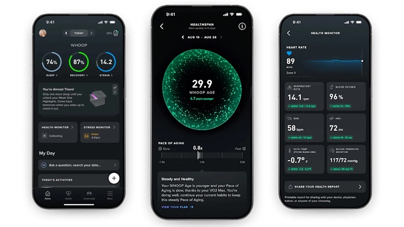 WHOOP MG (Medicinsk Grad) modellen erbjuder medicinsk grad monitorering: den upprätthåller EKG och övervakar blodtrycket för att upptäcka arytmier och andra hjärtproblem. Healthspan bedömer fysiologisk ålder och åldrandets hastighet. Gadgeten spårar påverkan av kvinnliga hormonförändringar på sömn, stress och återhämtning.