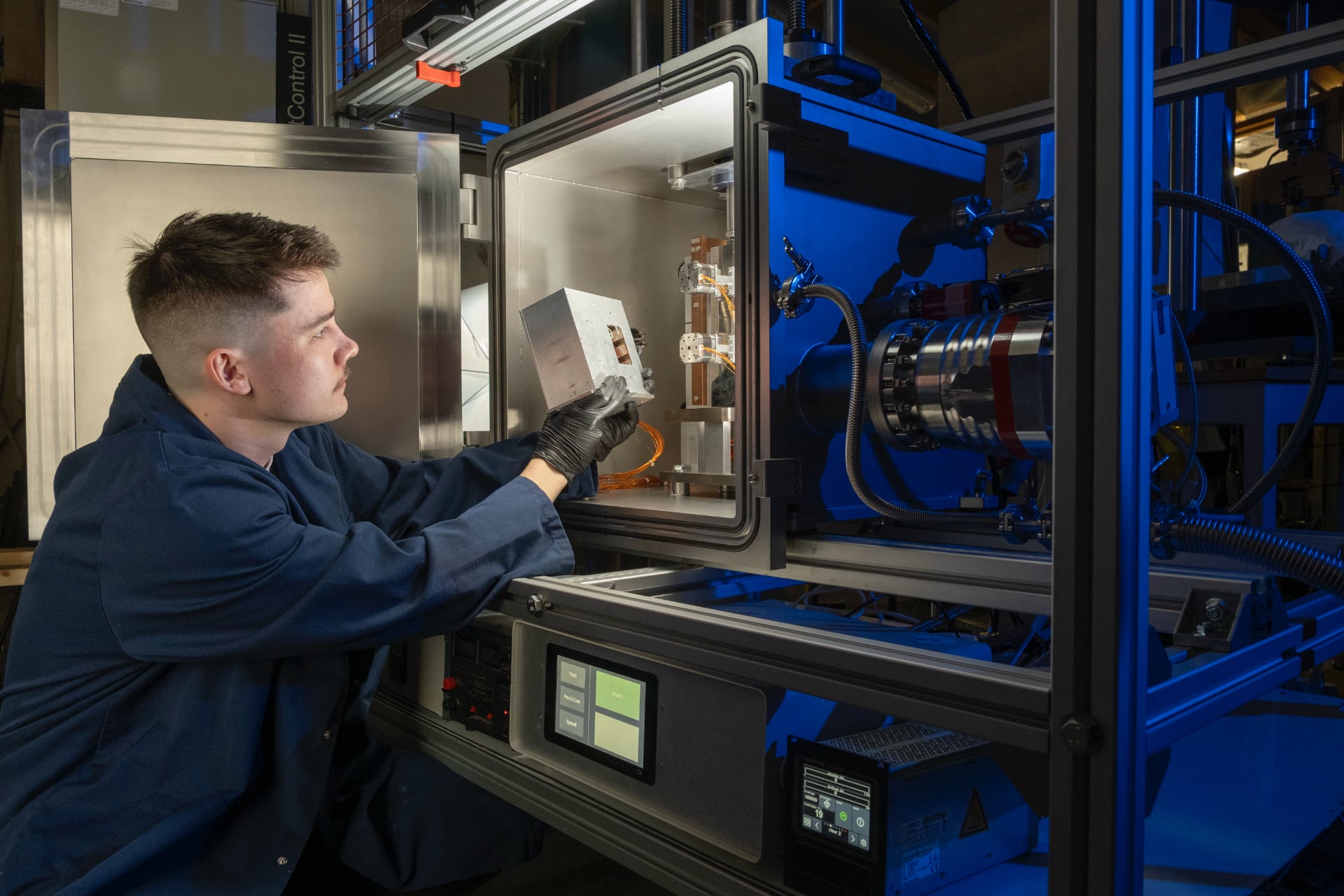 Ett nytt språng inom 3D-utskrift: Matthew Deans testar material i NextSpace TestRig Matthew Deans från James Watt School of Engineering laddar en patron med prover av 3D-skrivet material i NextSpace TestRig för testning. Källa: James Watt School of Engineering