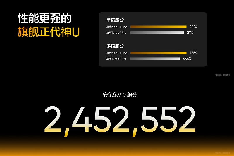 För hög prestanda ansvarar Realme Neo7 Turbo för chipsetet MediaTek Dimensity 9400e (4-nm, klockad upp till 3,4 GHz), som fick 2,45 miljoner poäng i AnTuTu-testet. Systemet kyls av en 7700 mm² avdampningskammare.