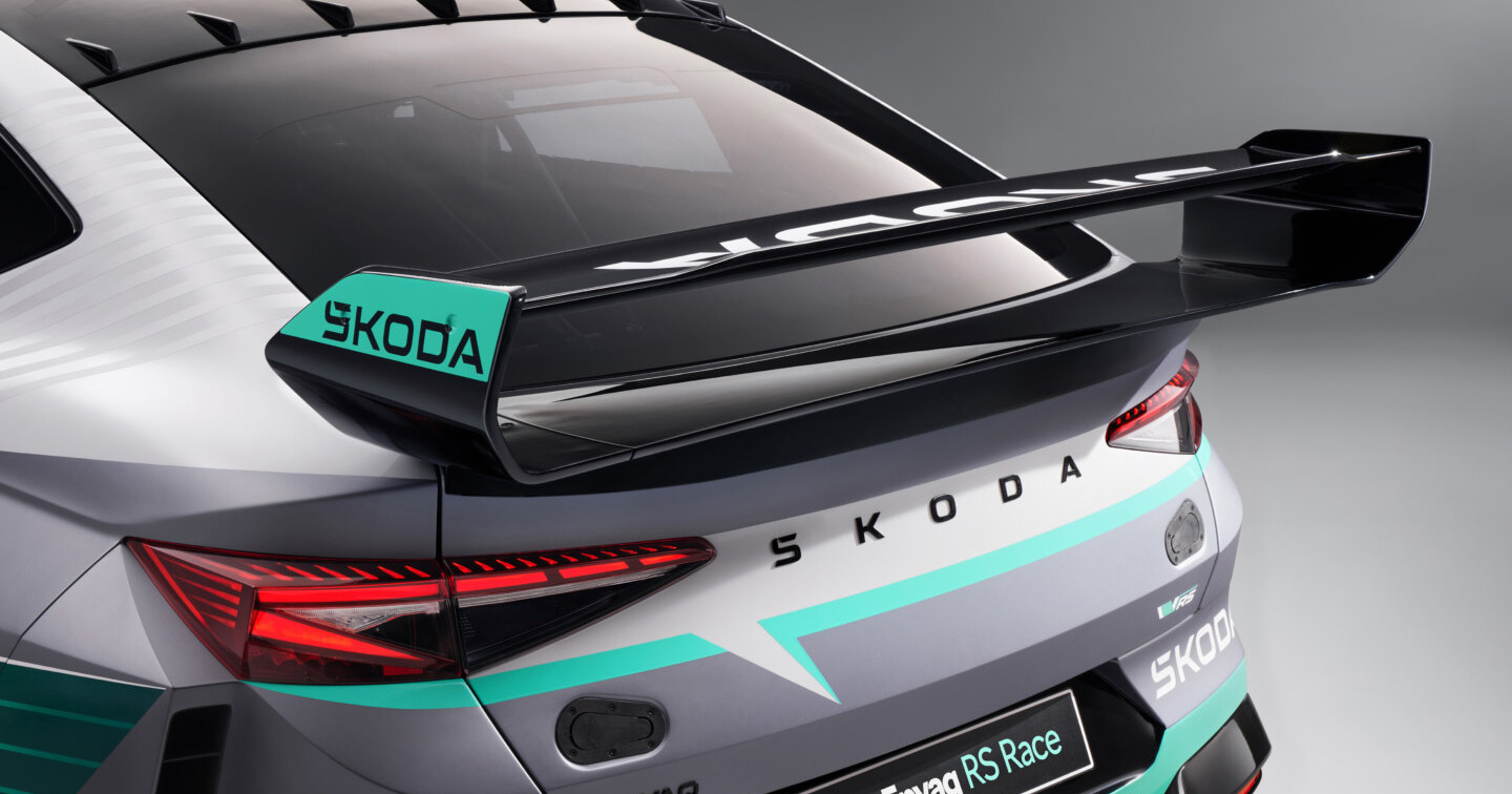 Den nya Enyaq RS Race har fått ett brett karosskit med aggressiva stötfångare, nya luftintag och vingar. Dessa kompletteras av ett aerodynamiskt optimerat tak, en massiv diffusor och minimalistiska sidospeglar.