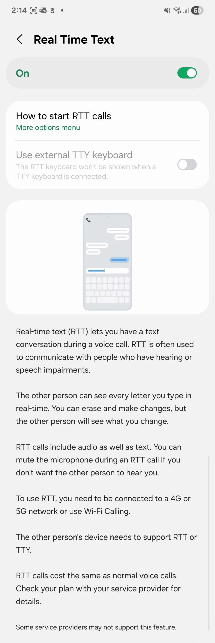 I inställningarna för Samsung Galaxy S25-telefonen har användare tillgång till alternativen "Hur man startar RTT-samtal" och "Använd en extern TTY-tangentbords", vilket utökar kommunikationsalternativen. För närvarande, enligt testare, är funktionen instabil eller aktiveras inte alls, även när man använder kompatibla enheter. Det är möjligt att det i nästa betaversion eller stabila uppdateringar kommer att åtgärda denna brist.