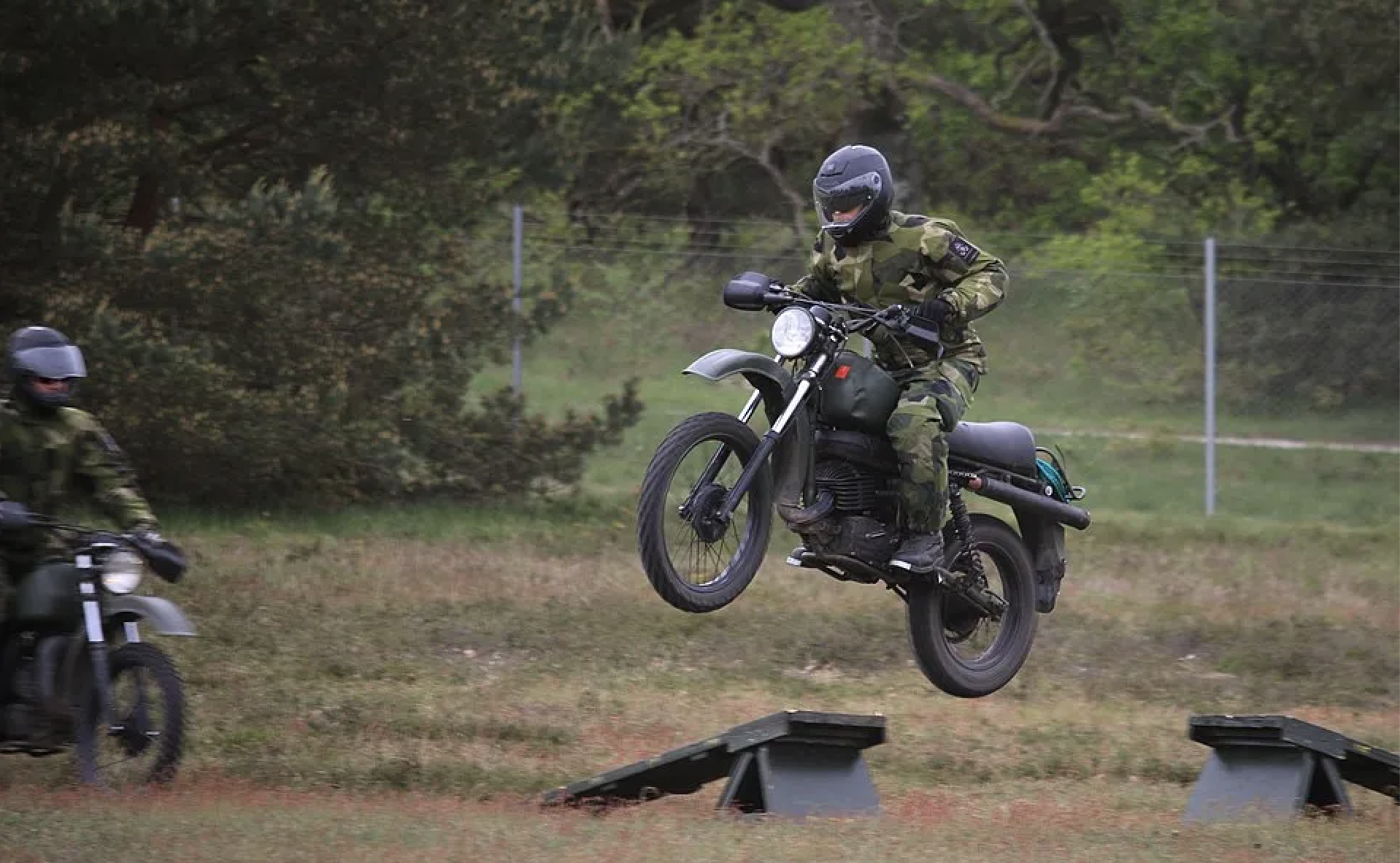 Svensk militär övar hopp med äldre MC 258 under en motorcykelutbildning.