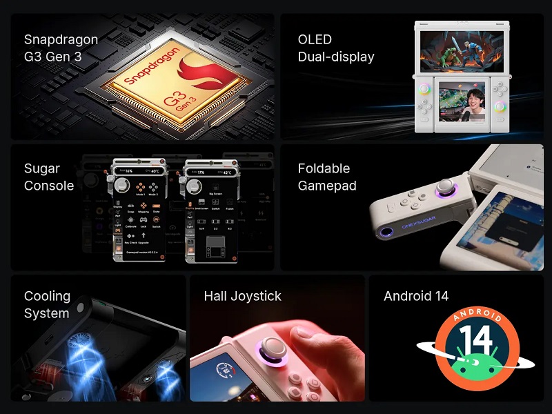 OneXSugar Sugar 1 får en Snapdragon G3 Gen 3 processor med integrerad Adreno A32 grafik och stöd för ray tracing. Konsolen har avtagbara kontroller och möjligheten att transformeras till olika formfaktorer, med en extra skärm antingen på toppen eller botten.