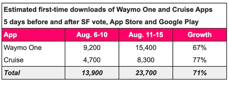 Totalt laddades Cruise-appen ner 146 000 gånger och Waymo One laddades ner cirka 513 000 gånger.