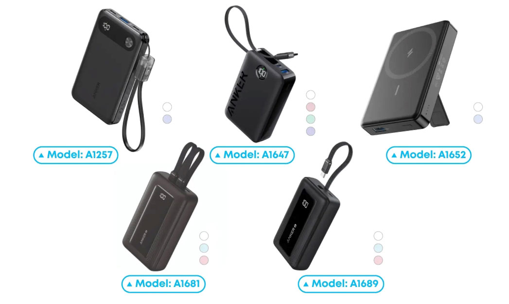 Anker återkallar fem modeller av powerbanker globalt (A1257, A1647, A1652, A1681, A1689) på grund av brandrisk.