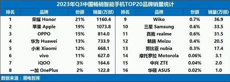Chaodian Think Tank publicerade statistik över den kinesiska smarttelefonmarknaden under tredje kvartalet 2023. Honor och Apple blev de enda företagen som kunde sälja mer än 10 miljoner enheter.