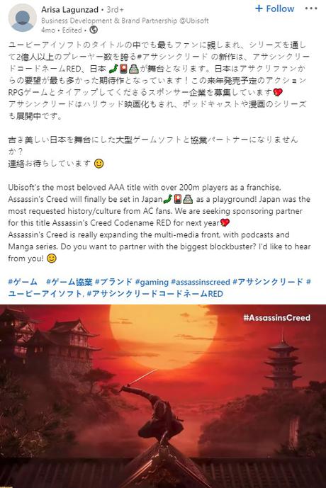 En av nyheterna kommer att vara det efterlängtade spelet i inställningen av feodala Japan - Assassin's Creed Red (arbetstitel). Officiell information om detta projekt är fortfarande begränsad till allmänna ord, men nätverket uppmärksammade inlägget av Arisa Lagunzad (Arisa Lagunzad) - affärsutvecklingschef för Ubisoft.